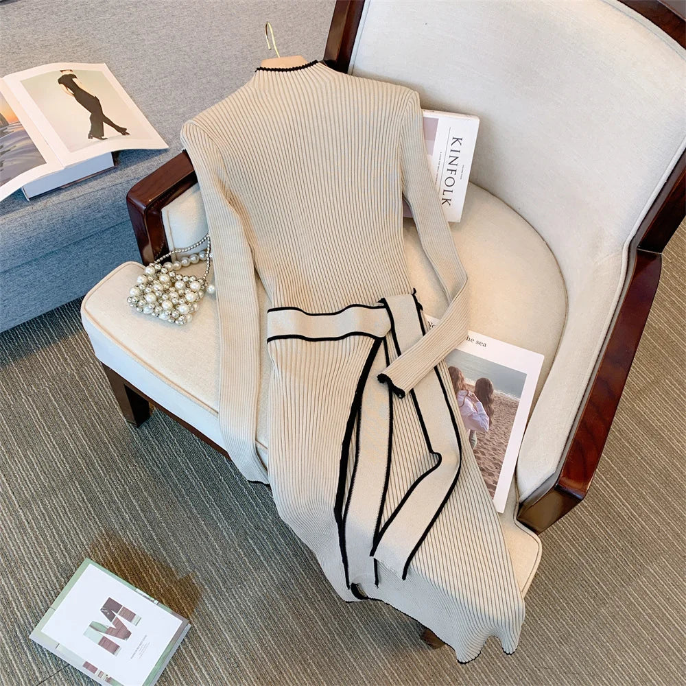2026年 新作 秋冬 スタンドカラー 長袖 ニットワンピース ヒットカラー ストライプ バンデージウエスト ボディコン ベルト付きドレス