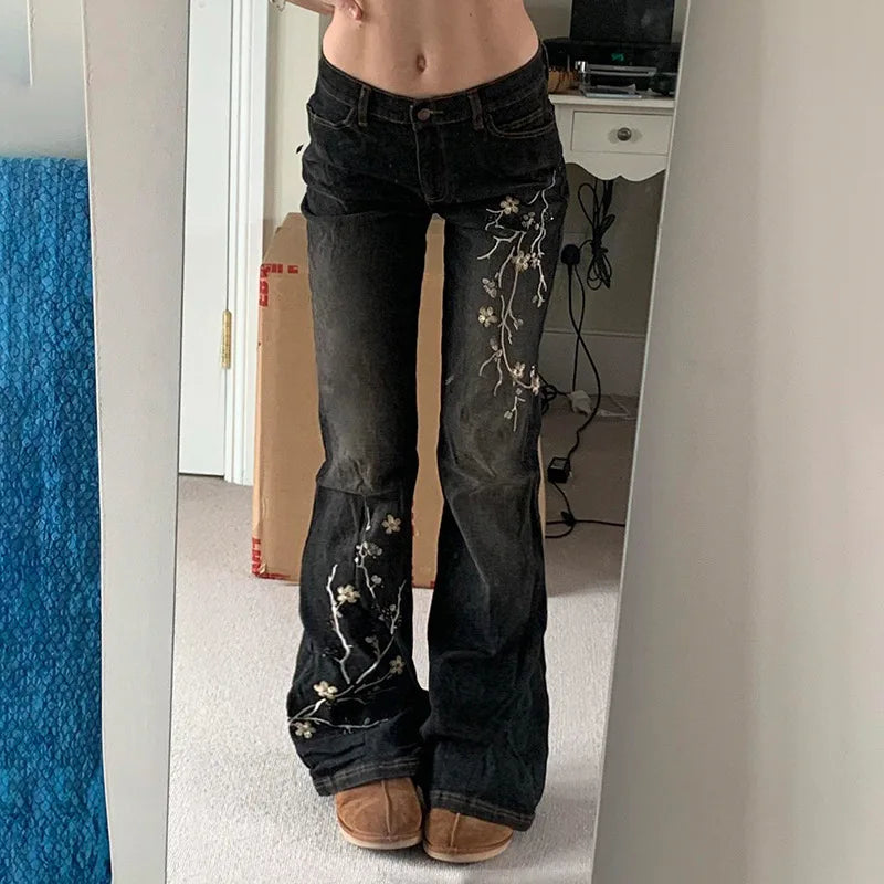 アメリカンレトロ フレアジーンズ レディース スリムフィット ややゆったり プラント刺繍入り ローウエストデザインパンツ