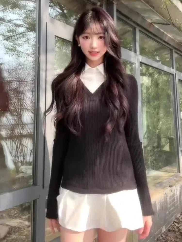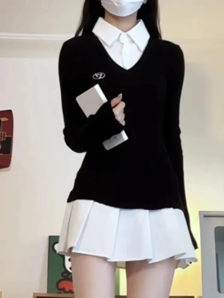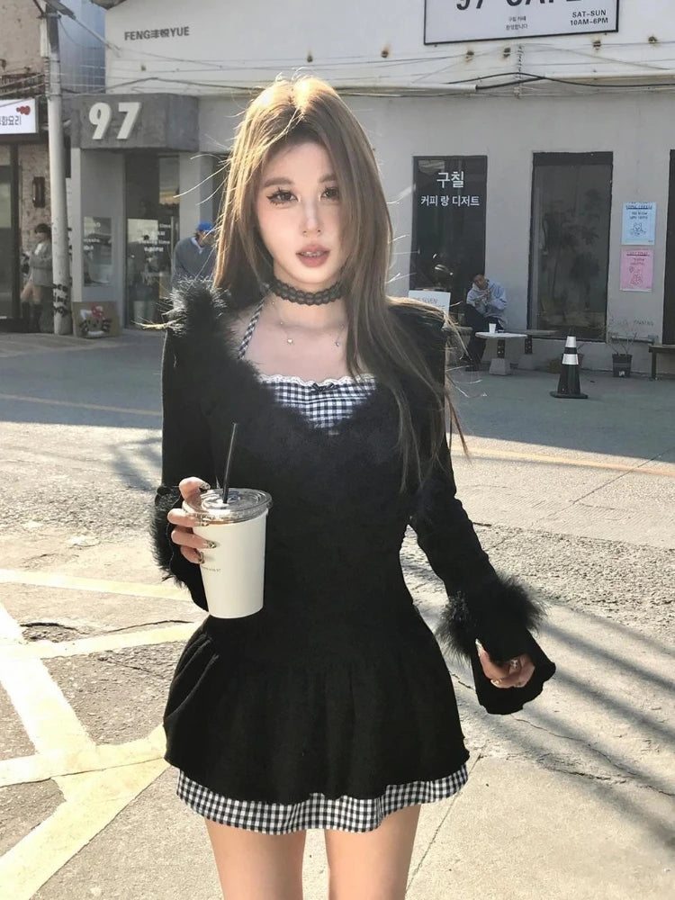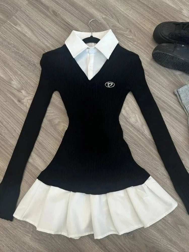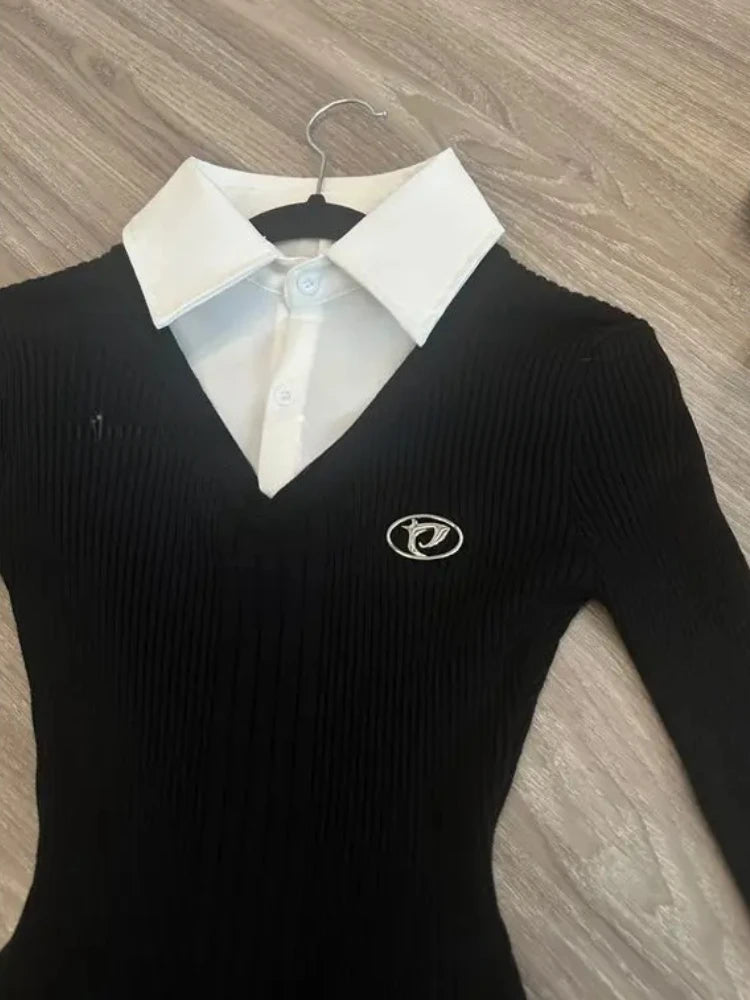 アメリカンヴィンテージシャツ 長袖 ミニドレス レディース スリムフィット ポロネック ブラック ショート パーティードレス 韓国ファッション 秋