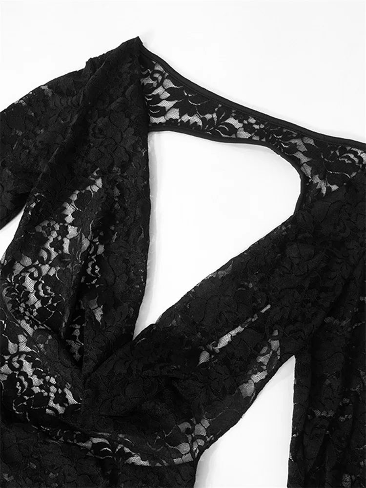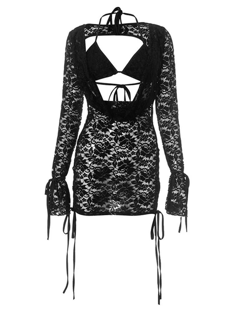 CHRONSTYLE レディース 長袖ドレス カジュアル シースルーレース 深Vネック スリムミニドレス ホルターブラ付き カクテル ストリートウェア