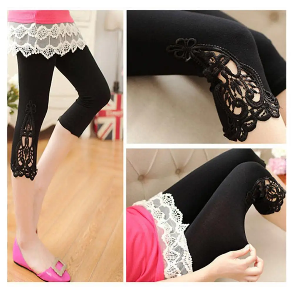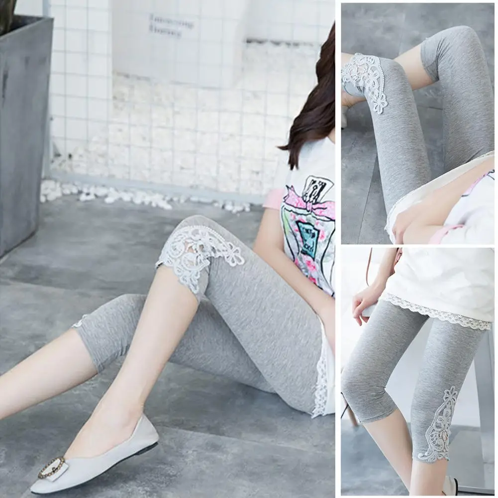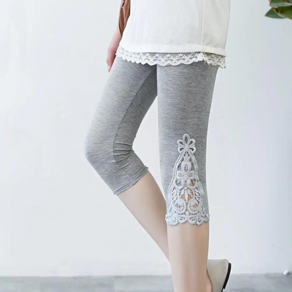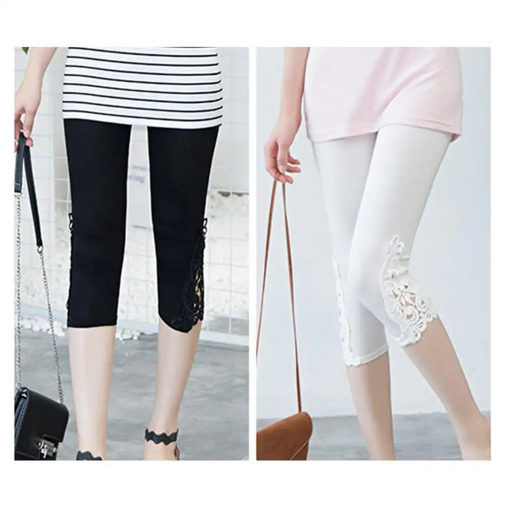 レディースクロップドレギンス エラスティックウエスト 刺繍レースステッチ 夏用 ストレッチ薄手 タイトフィットパンツ