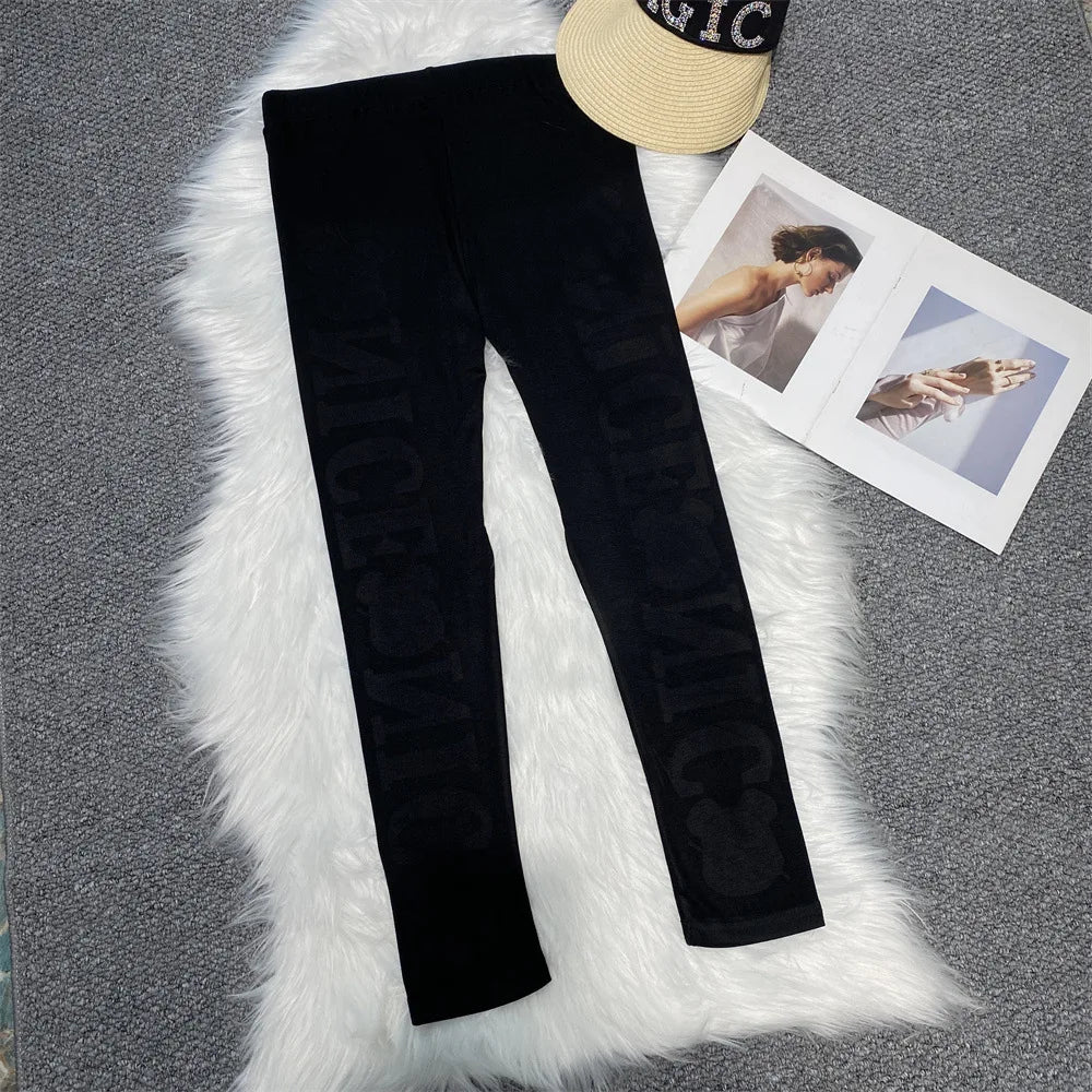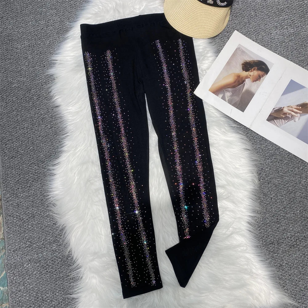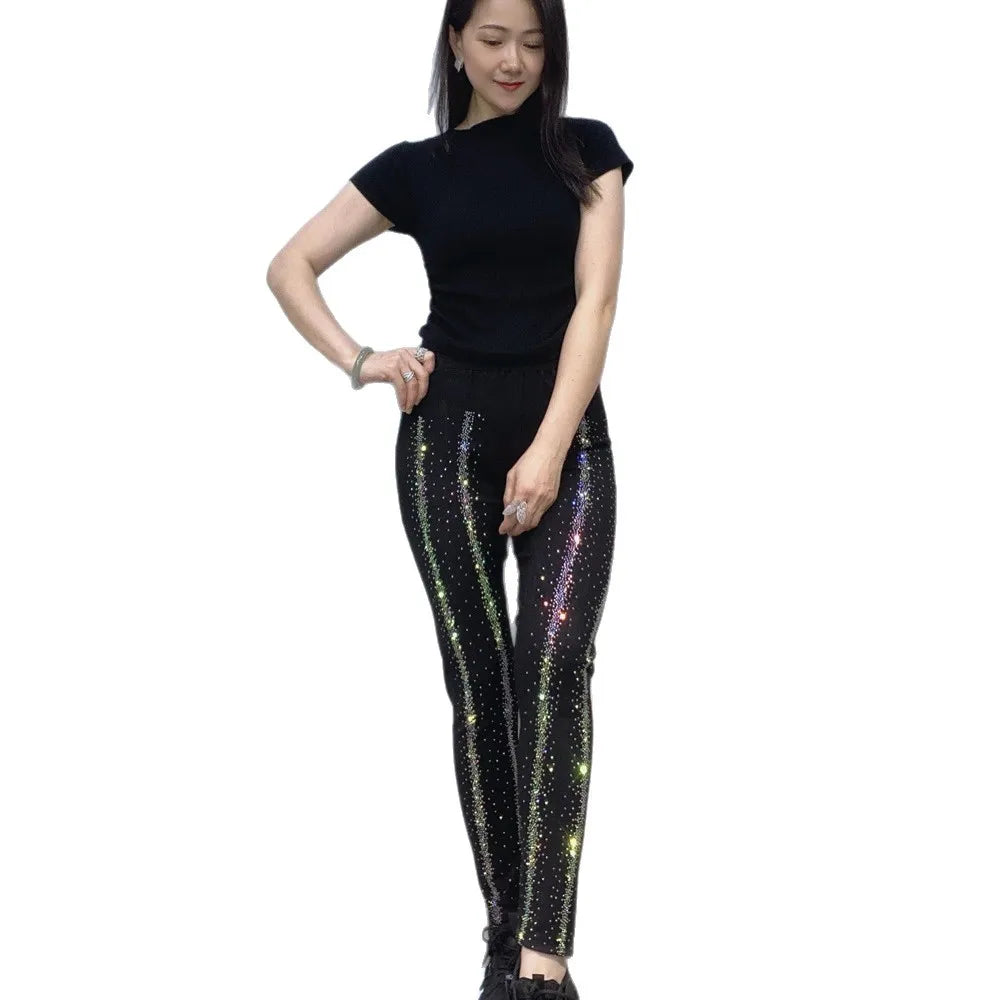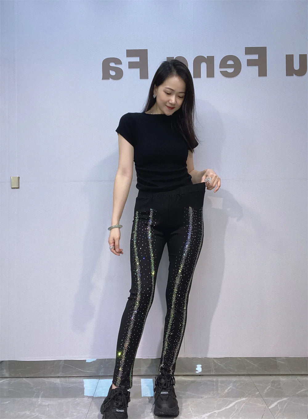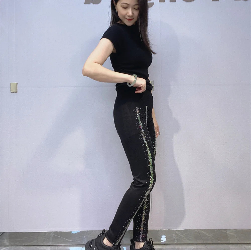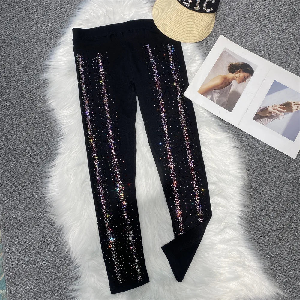 レディース用伸縮性万能レギンス 秋新作 ラインストーン付き縦縞 ブラック スリムフィットパンツ レディース服