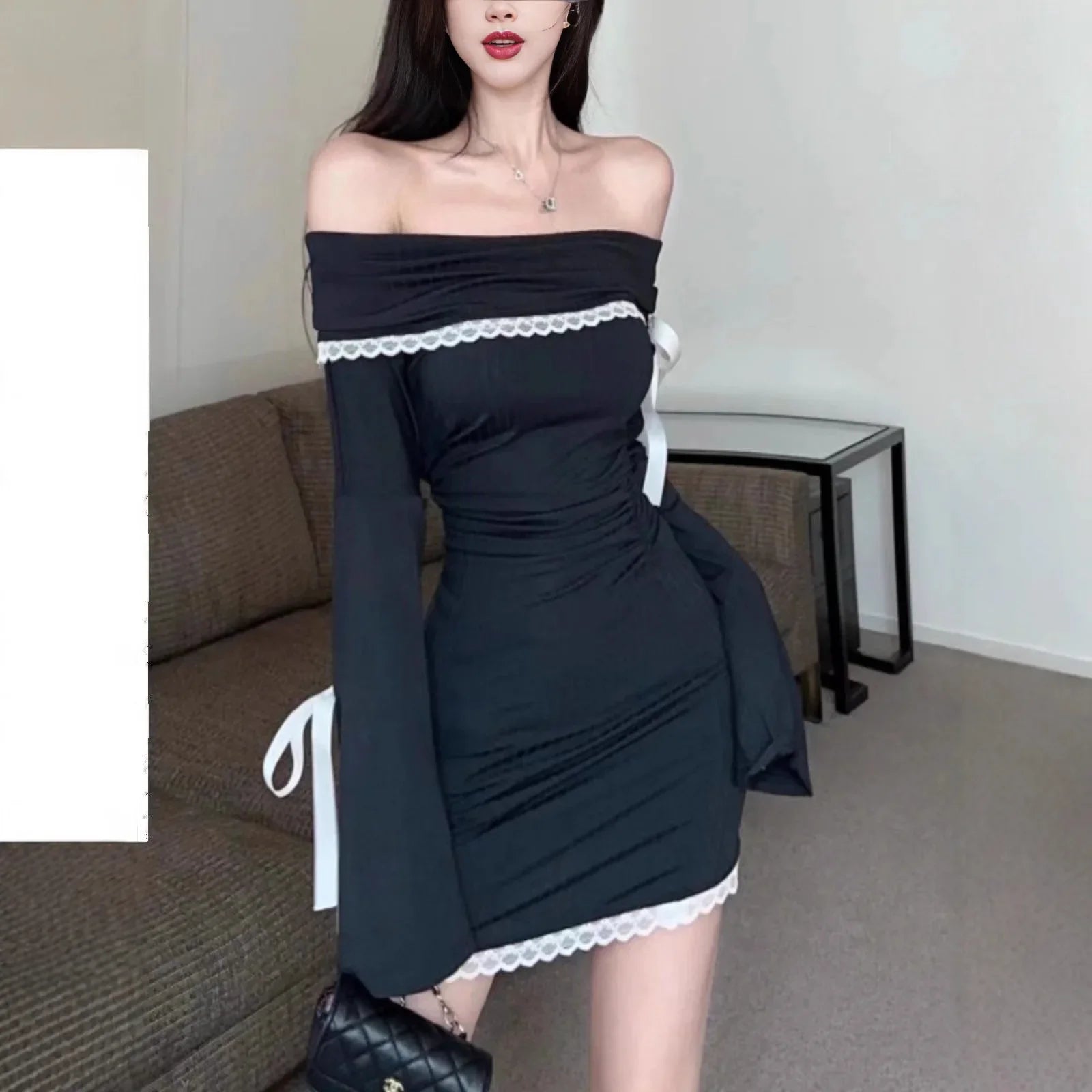 エレガントなフレンチスタイル レース切り替え ワンショルダー 長袖 ブラックドレス レディース セクシー フレアスリーブ ボディコン ミニスカートドレス