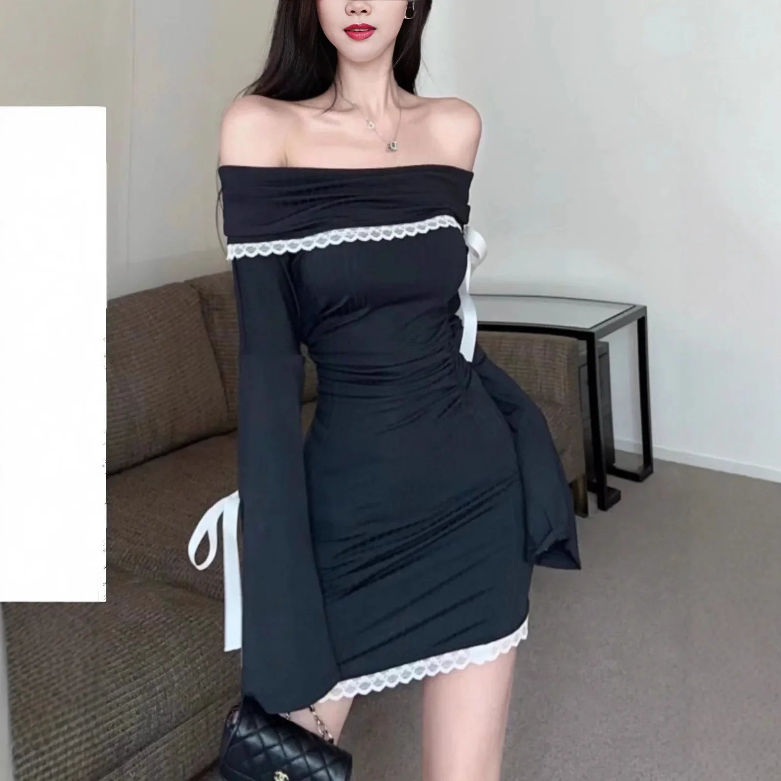 エレガントなフレンチスタイル レース切り替え ワンショルダー 長袖 ブラックドレス レディース セクシー フレアスリーブ ミニスカート ポリエステル繊維
