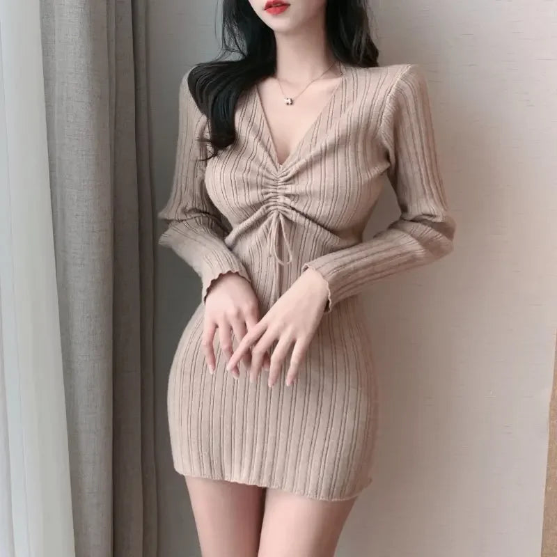 エレガントVネックドローストリング長袖無地ミニニットワンピース 秋 セクシースリムフィット レディースドレス エレガントレディースニットウェア