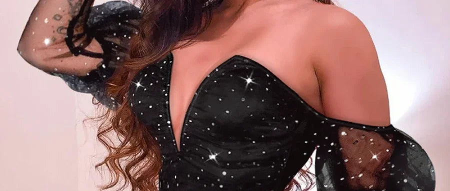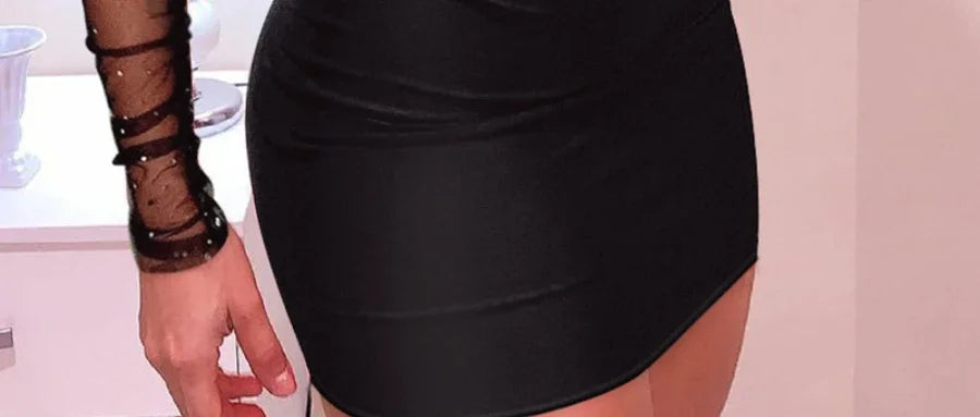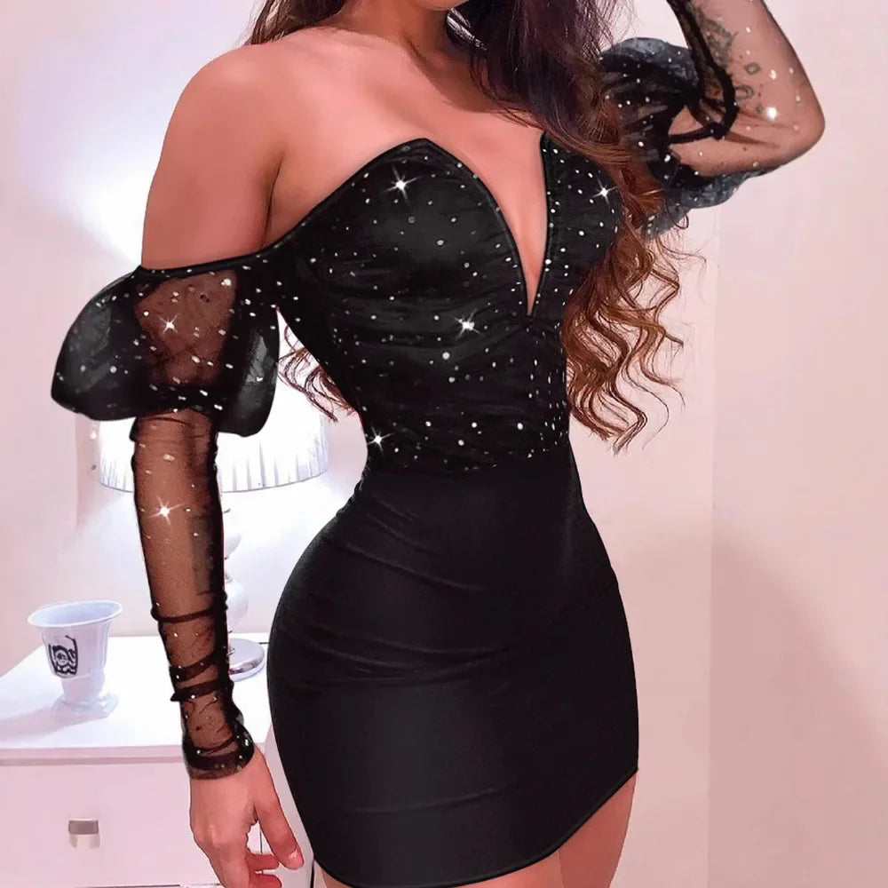 ファッションメッシュステッチスプリンクルスリムドレス レディース 長袖 ハイウエスト セクシーボディコンミニドレス