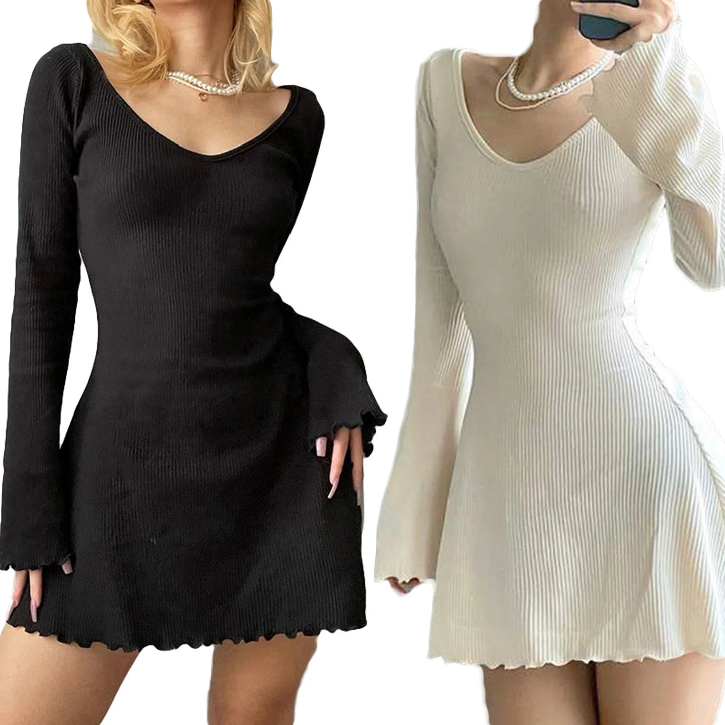 ファッション レディース 夏用 スリム Aライン ワンピース 無地 リブ 長袖 Vネック スリムフィット ミニドレス パーティー ビーチウェア Y2K