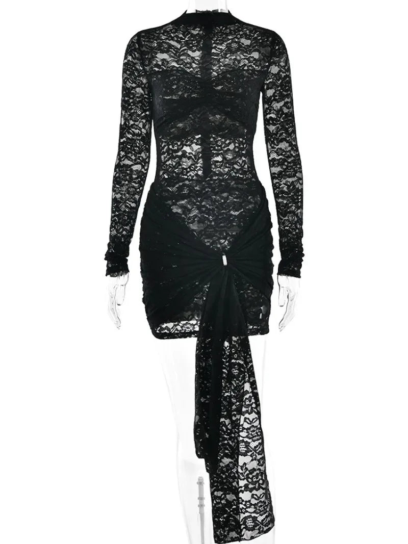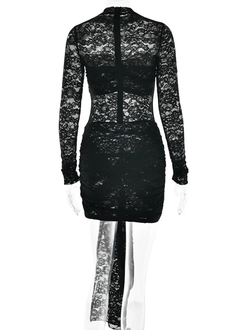 FDYOUI シックな長袖バンデージレースショートドレス レディース用 無地ブラック ボディコン シースルー ギャザー入りミニ パーティーイブニングドレス