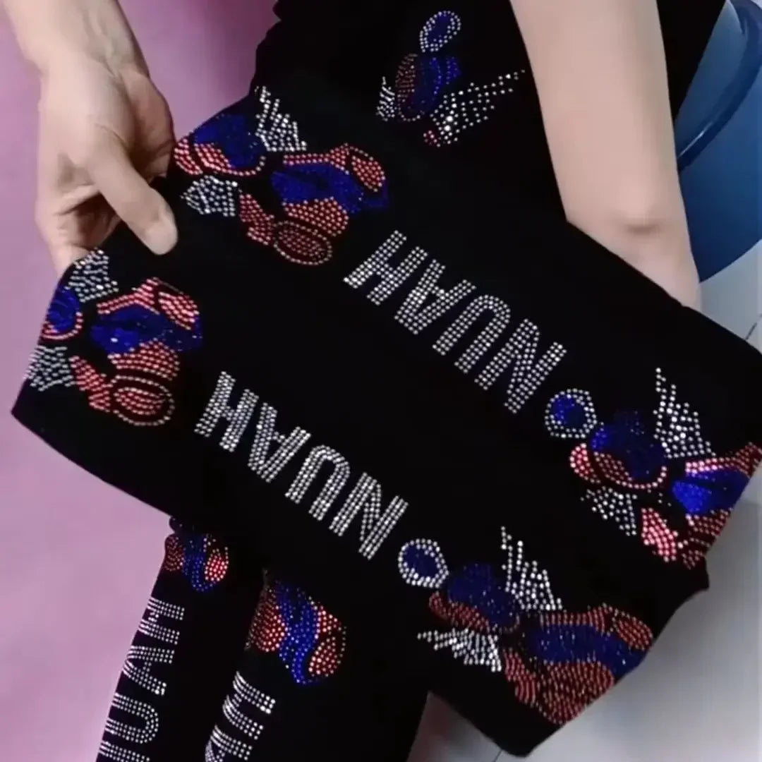 ハイウエスト、伸縮性あり、スリムフィット、多用途でキラキラのラインストーン7分丈パンツ 新色カラフルで明るいダイヤモンド レディースレギンス 1