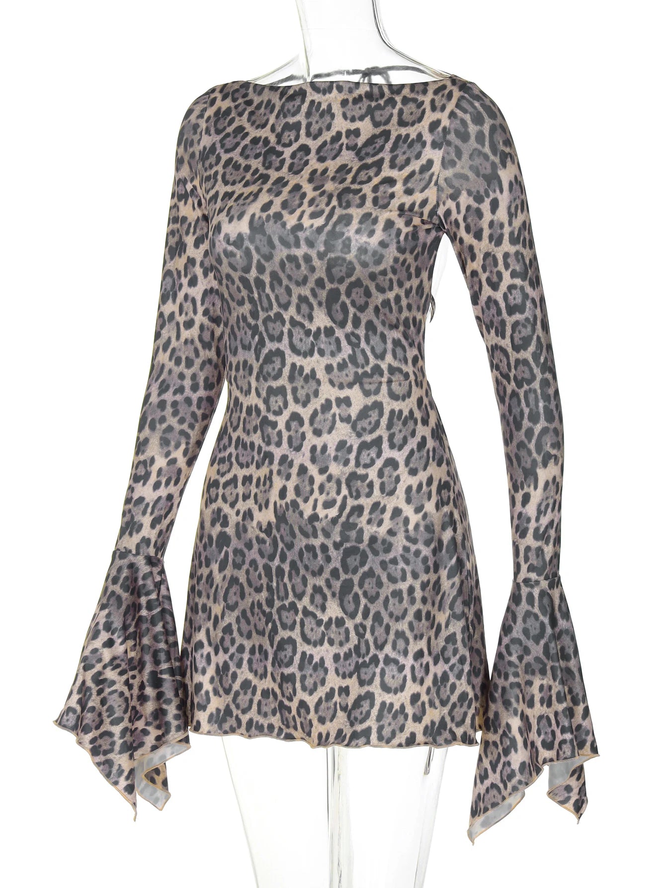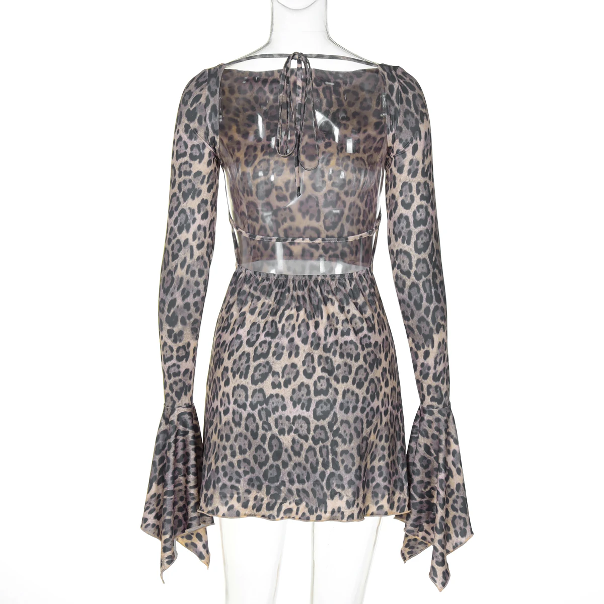 Hugcitar 2025 レオパード柄 ロングフレアスリーブ バックレス レースアップ セクシー スリム ミニドレス レディース ファッションコーデ ビーチフェスティバル