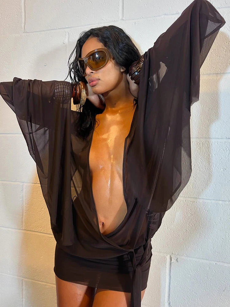 kliou メッシュ イレギュラー レディース ミニドレス セクシー シースルー シック 長袖 ディープロー ネック バンデージ スリム ワンピース ムヘール コケット フロック