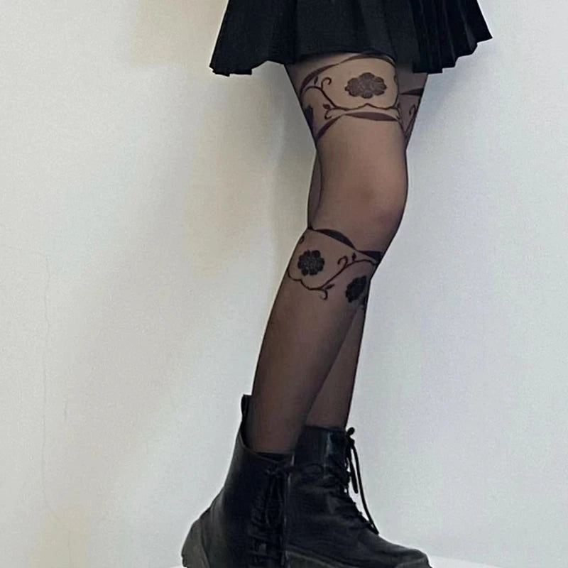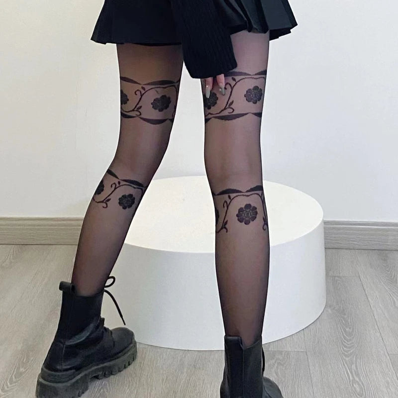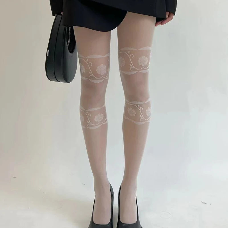 韓国風フラワー柄パンティーストッキング スリムレッグ レディース 薄手タイツ 夏秋用 レトロ ハイエラスティック ロング太ももストッキング 女性用