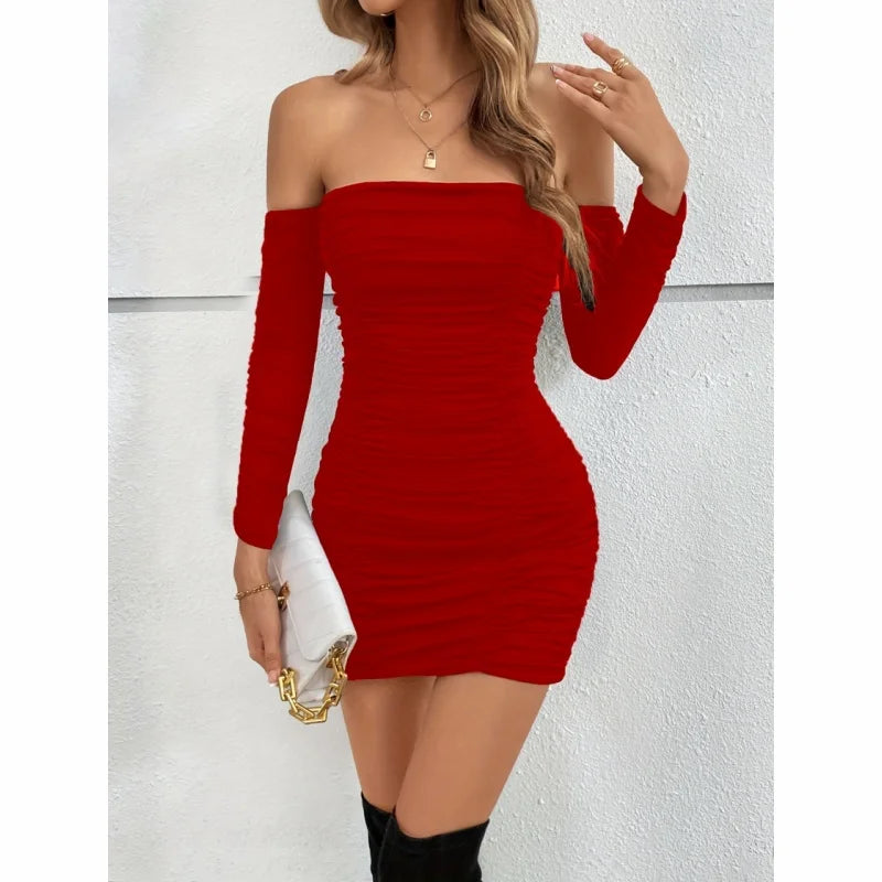 Lamuusaa y2k ギャザー入りドレス セクシーな女性用服 無地 オフショルダー 長袖 ボディコン ミニドレス パーティードレス クラブウェア
