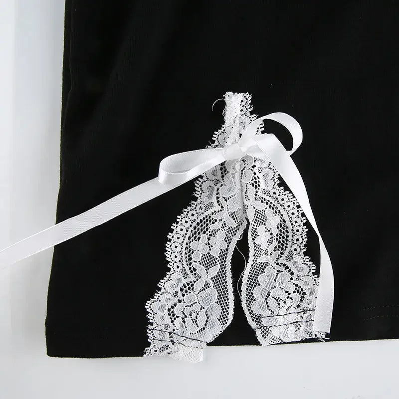 レディース長袖ドレス デザインパッチワーク レースリボン スクエアカラー サイドスリット Aライン エンパイア ブラック セクシー ミニ ボディコン ドレス フェミニン