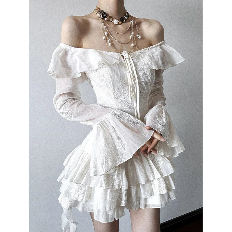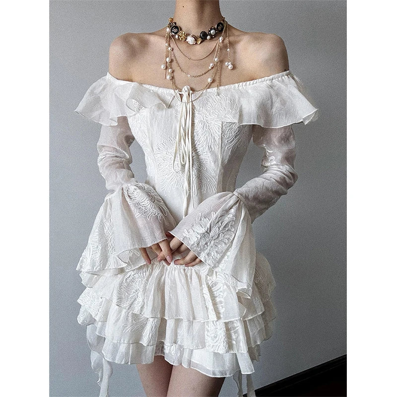 MEXZT Y2K スラッシュネック ミニドレス レディース パーティー フェアリー ラッフル フレア 長袖 ドレス 夏 エステティック セクシー ボディコン ベスティドス 新作
