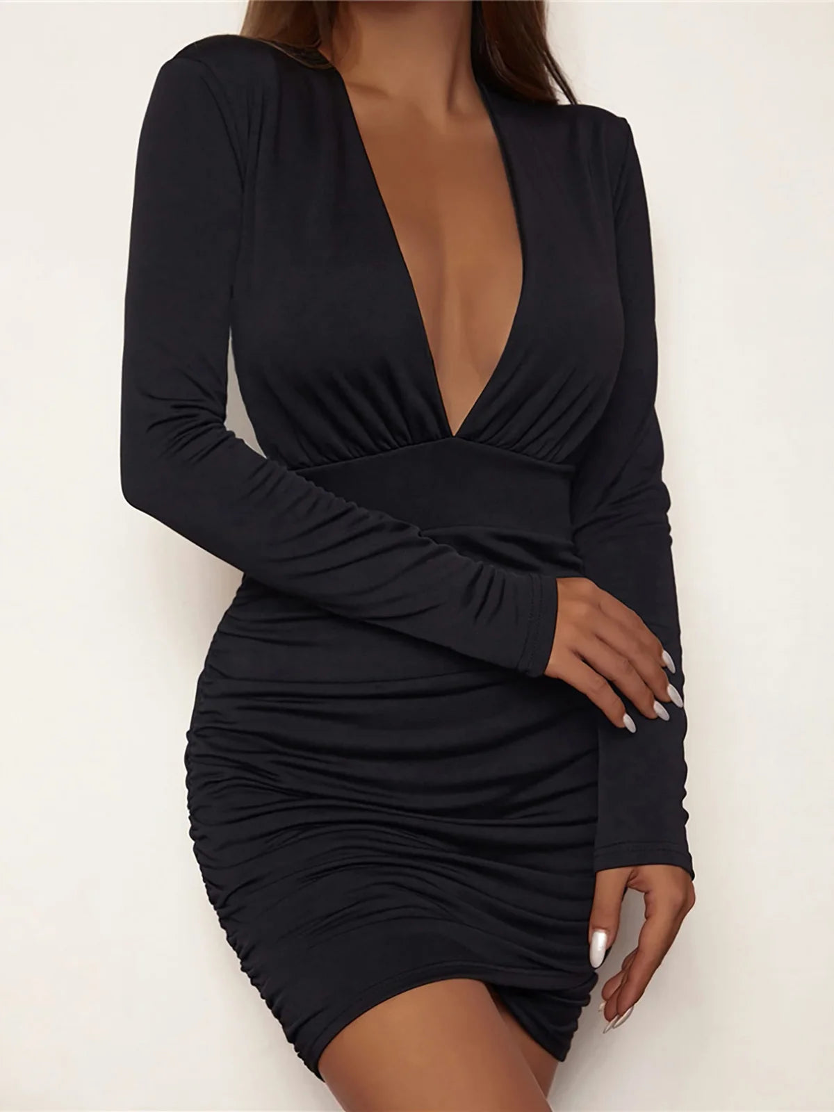 新作Vネックプリーツ長袖ドレス パーティー用ボディコンドレス エレガントミニドレス レディースタイトドレス クラブウェア ワンピース D371