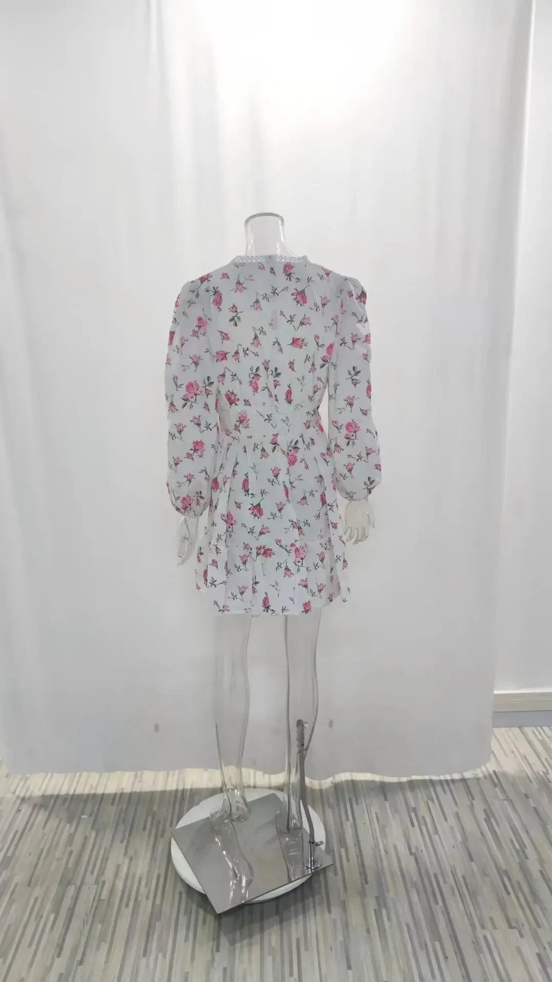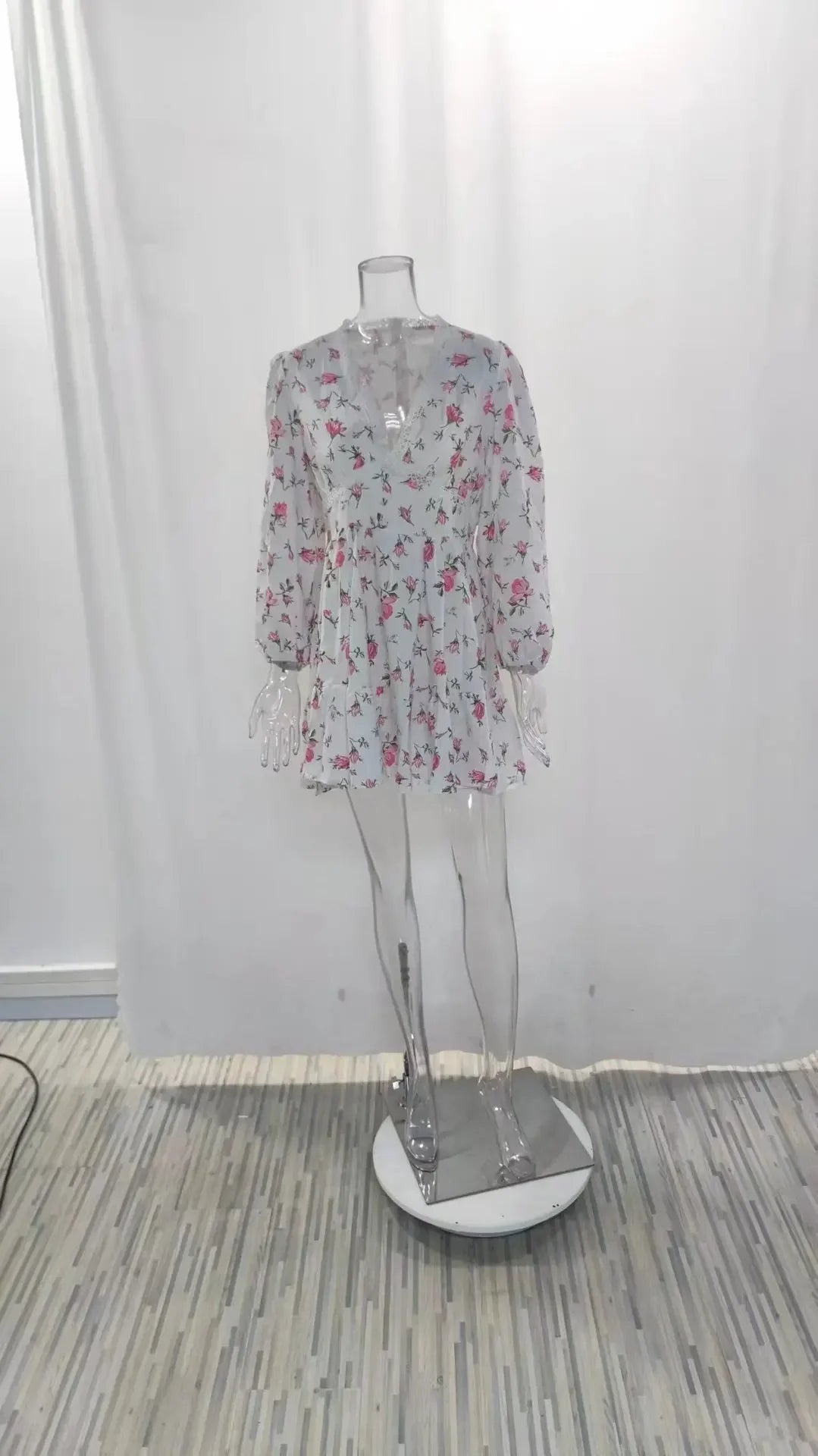 プリントVネックレースショートドレス スリムフィット 2024年夏 セクシードレス 長袖 レディース スイート ハイウエスト セクシーAラインミニドレス