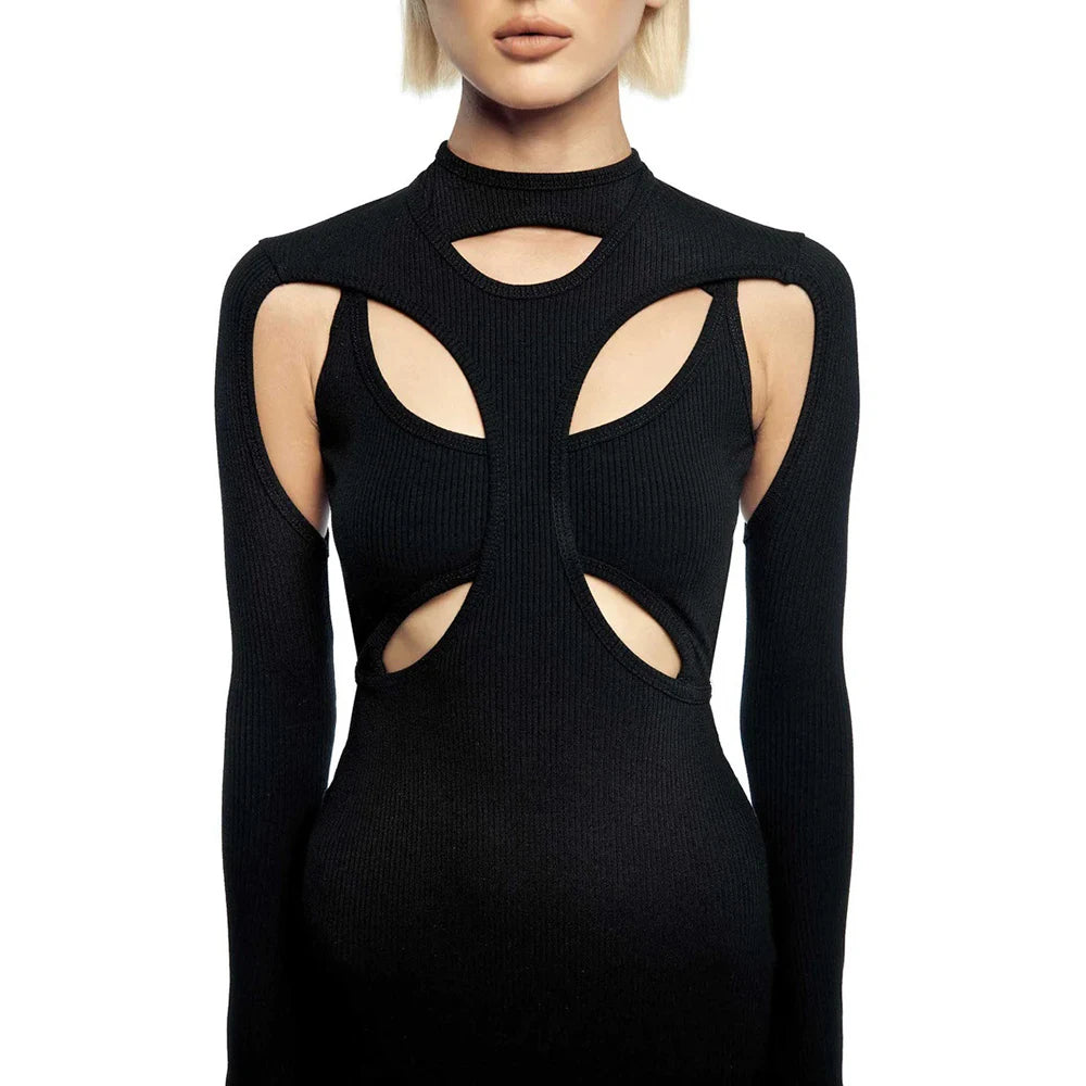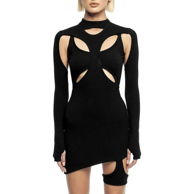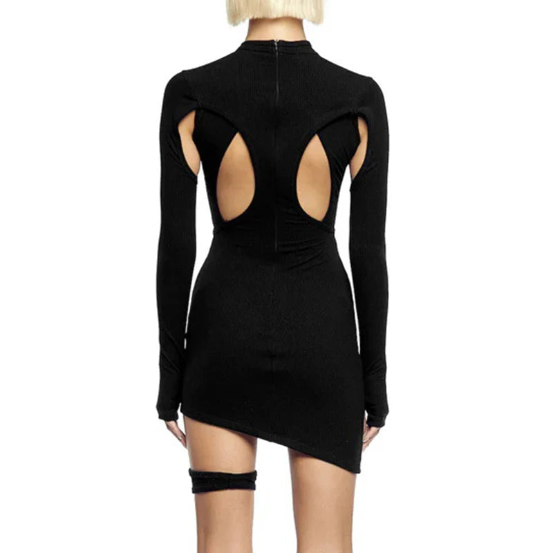 セクシーでホットな女の子用無地ラウンドネック長袖セクシーなホールアウトスリムフィットお尻が包み込む個性的デザインワンピース女性用秋向け