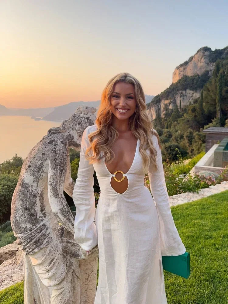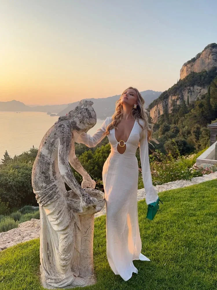 セクシー ホワイト ディープVネック ロングワンピース レディース エレガント 長袖 ホールアウト メタルリング スリムフィット ドレス 新作 ホリデー レディ パーティーウェア
