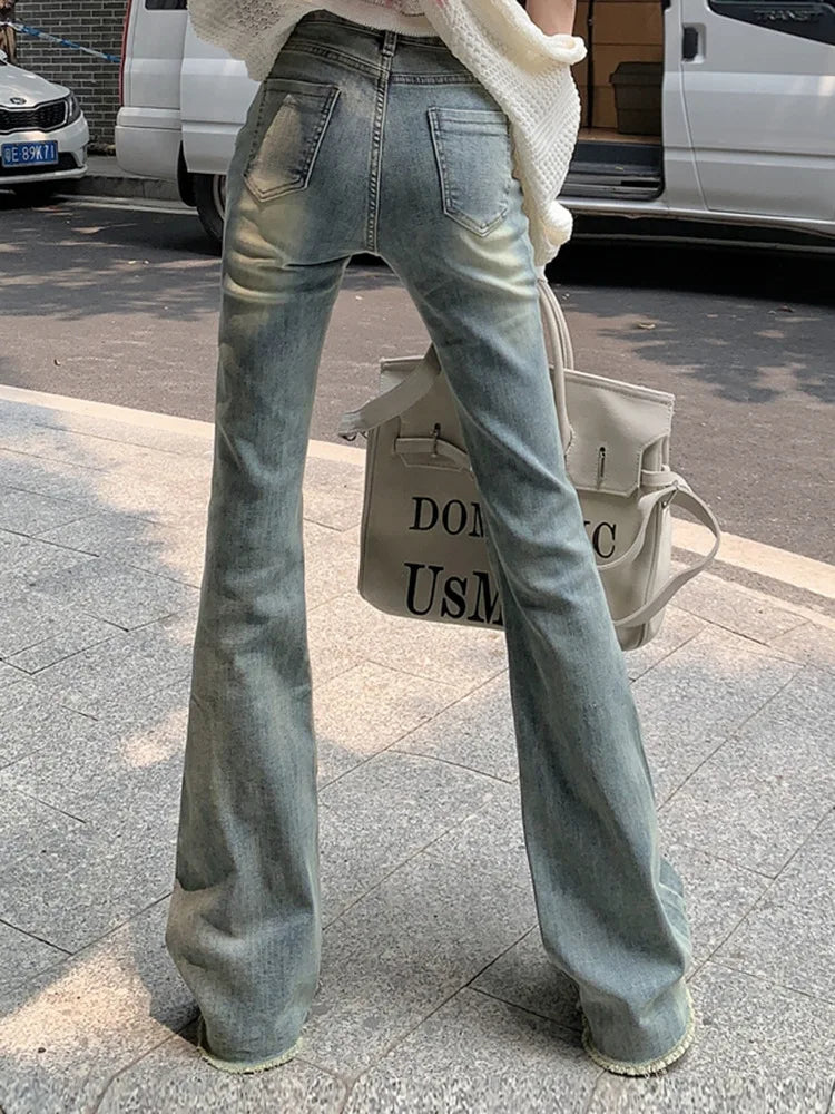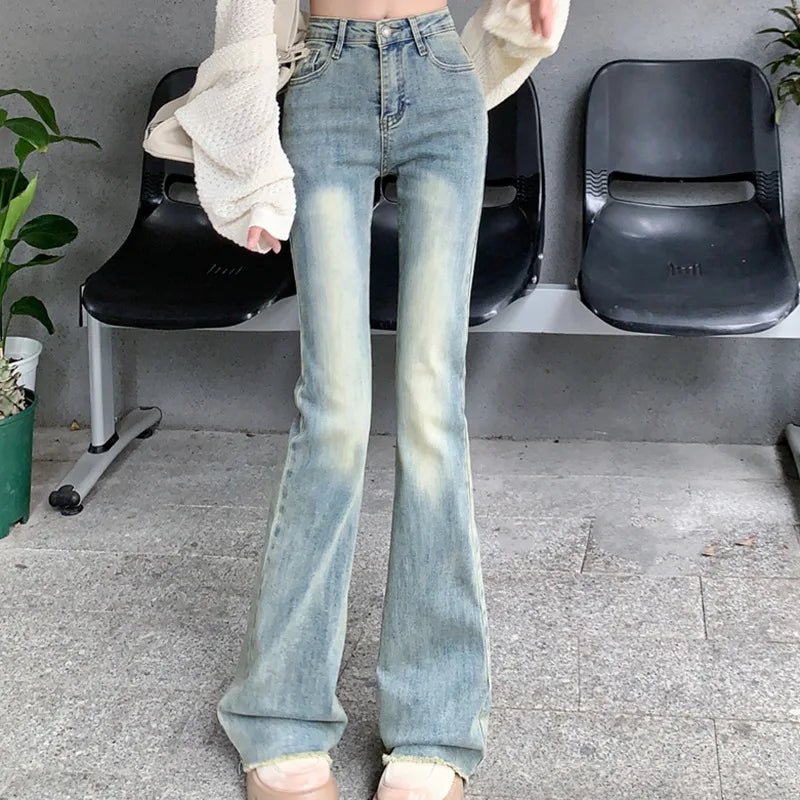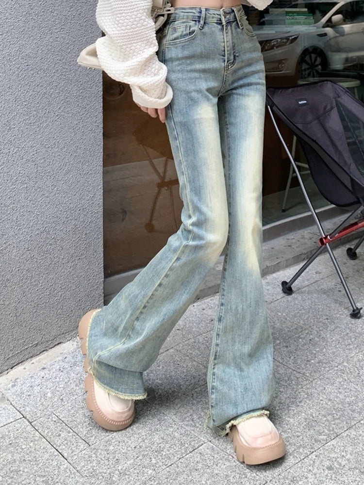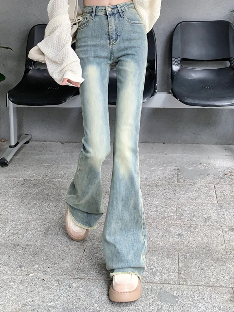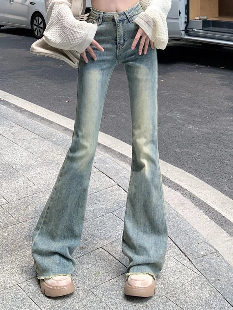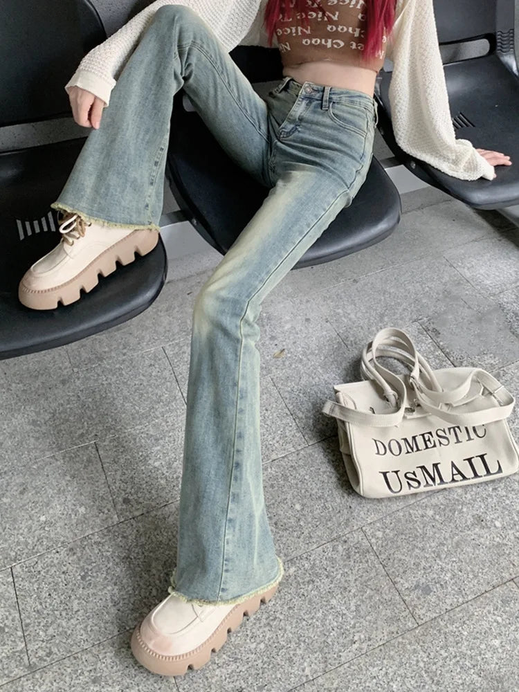 春夏スパイシーガールスタイル 新作ブルーストレッチジーンズ レディース フリンジ付きハイウエストスキニーレトロルーズベルボトムジーンズ サイズ S-2XL