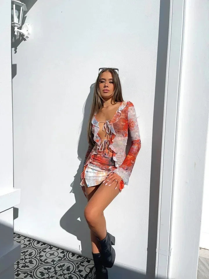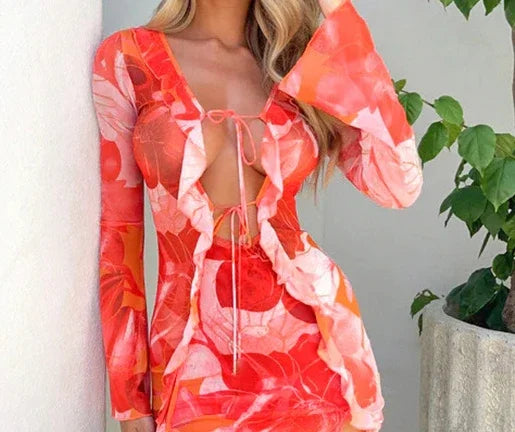 ステッチライトラッフルエッジ レディース フラワープリント メッシュ レースアップ 長袖 スリムフィット セクシー ドレス ボディコン ミニ