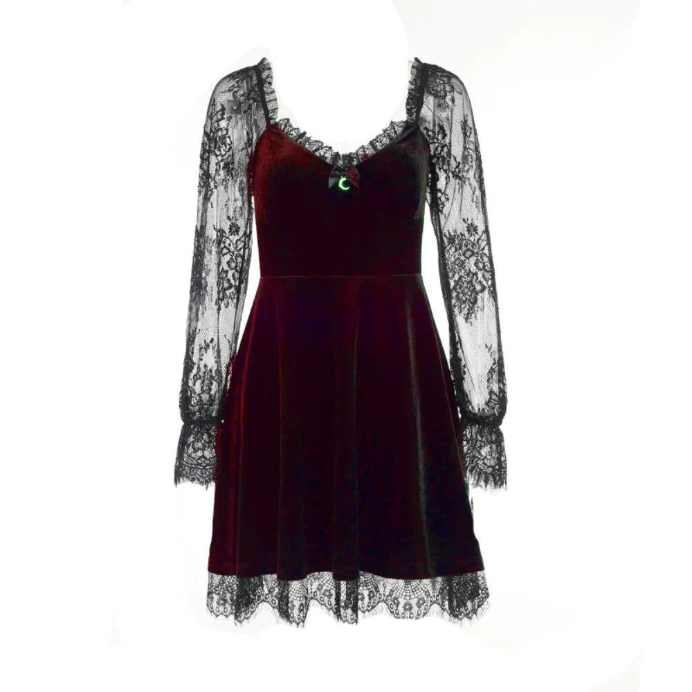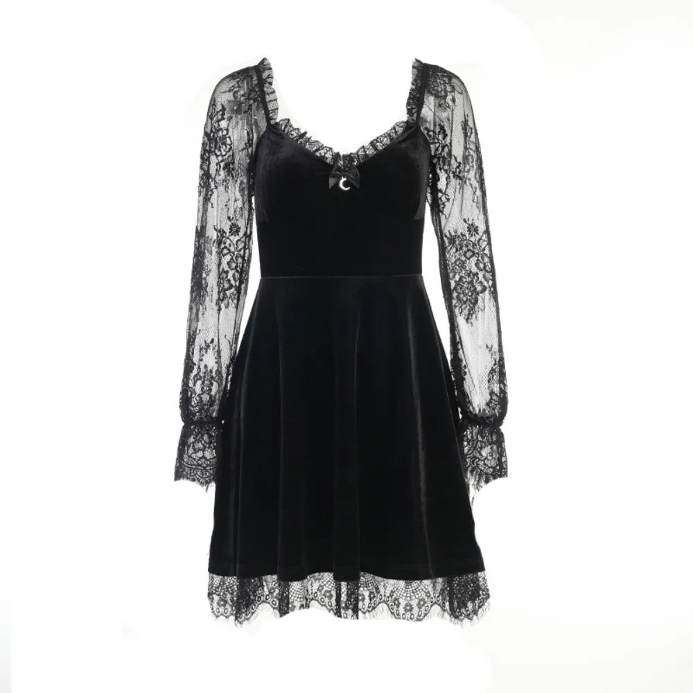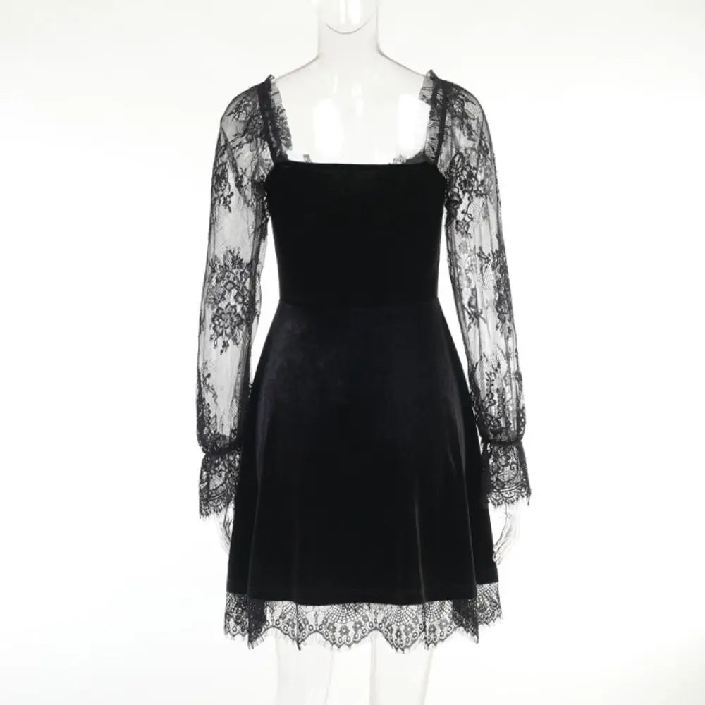 透け感ロングスリーブラッフルミニドレス ヴィンテージパッチワークゴシックドレス レディース Y2K Vネックフロッキングレーストリムボディコンドレス