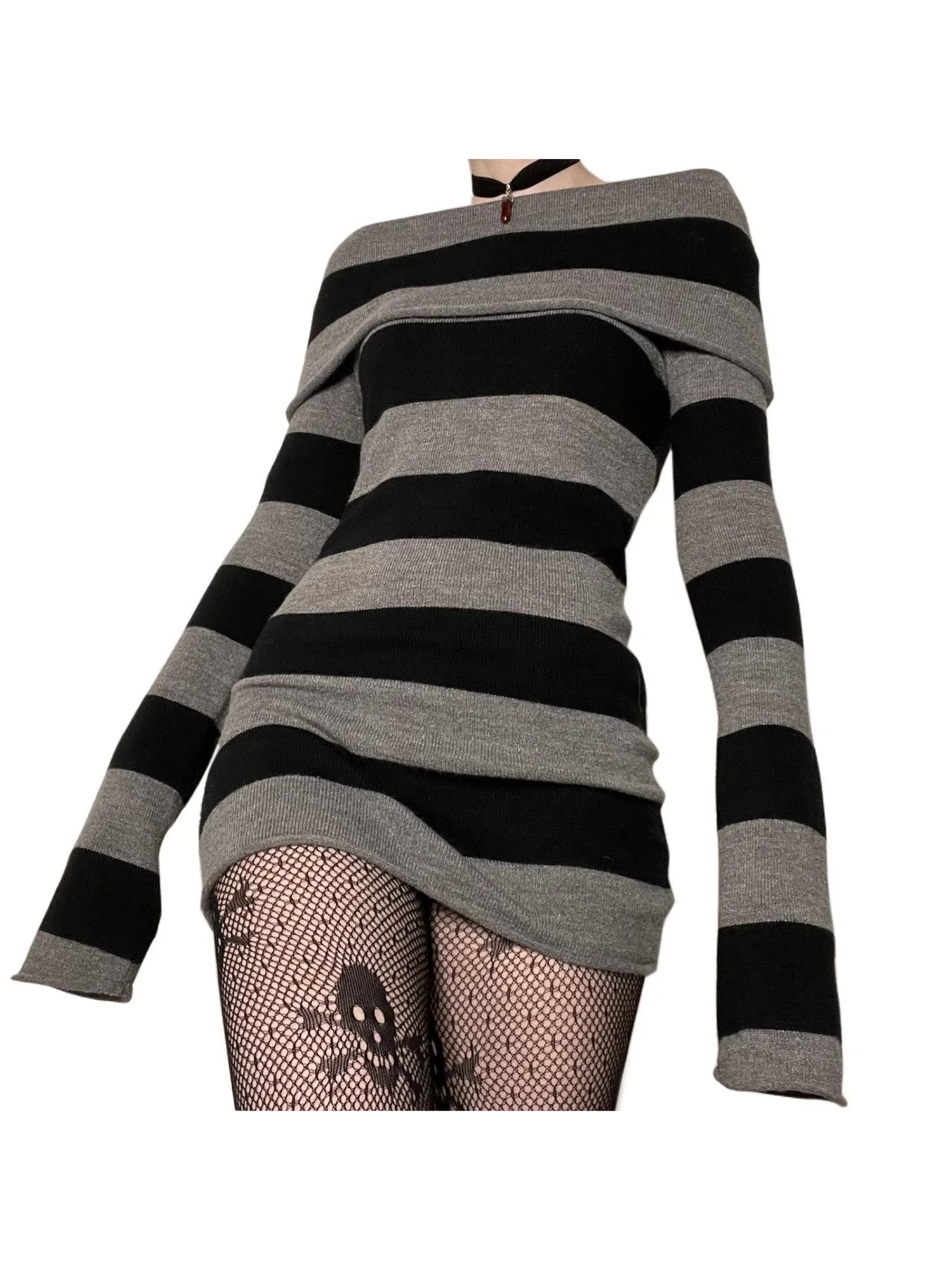 レディース Y2K ニットミニドレス ストライプ 長袖 オフショルダー ボディコン ショートセータードレス トレンディ ナイトクラブ ストリートウェア