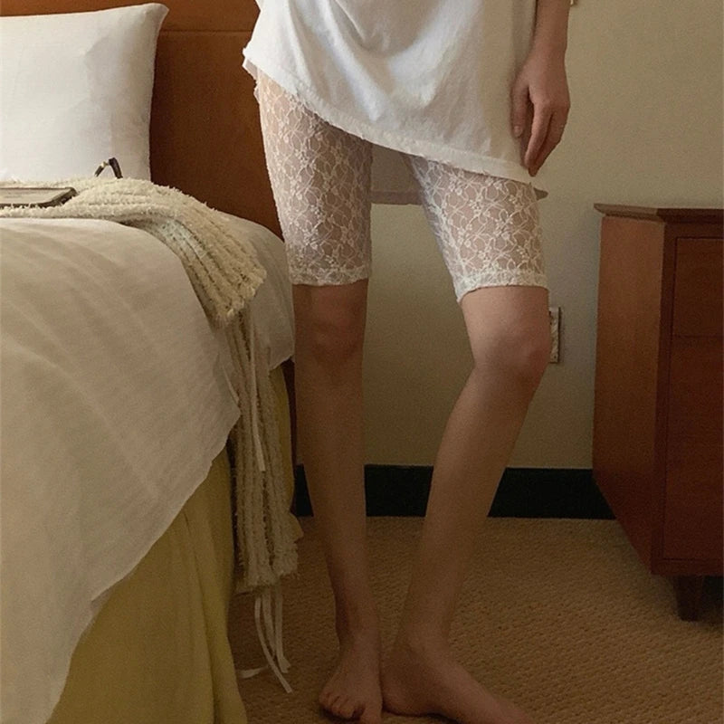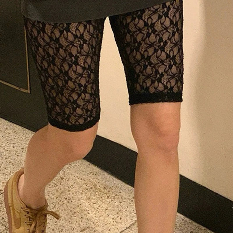 レディース セクシー ハイウエスト シアーメッシュ バイカーショーツ ワークアウト ジム 透け感 フラワーレース ボディコン ショートレギンス タイツ