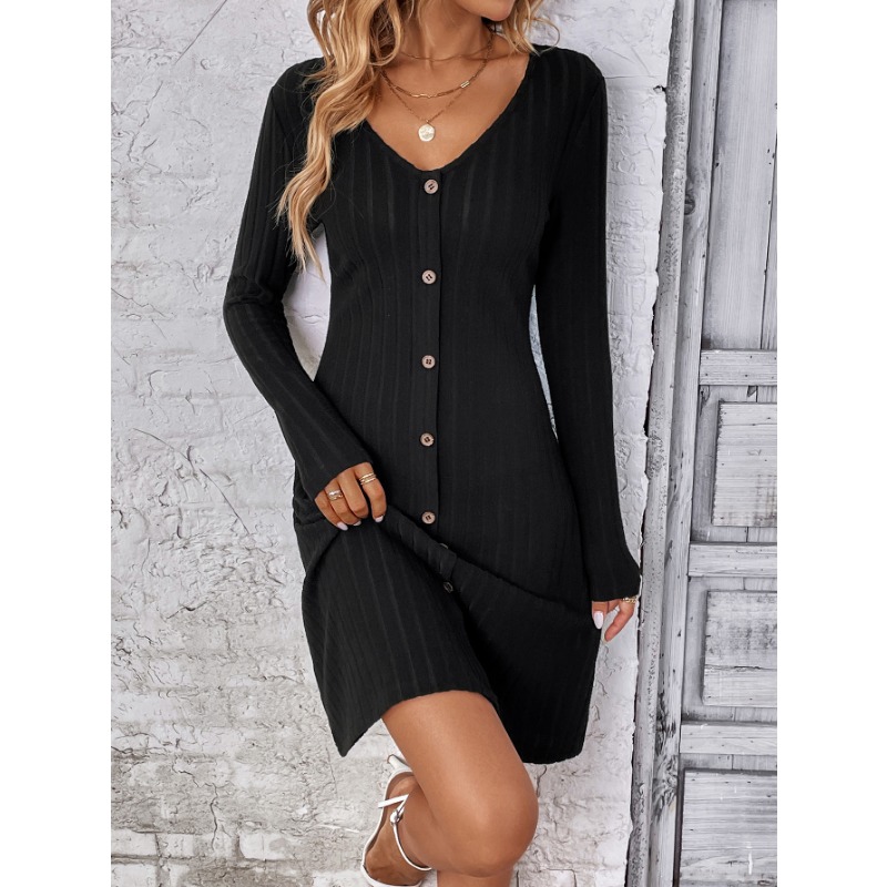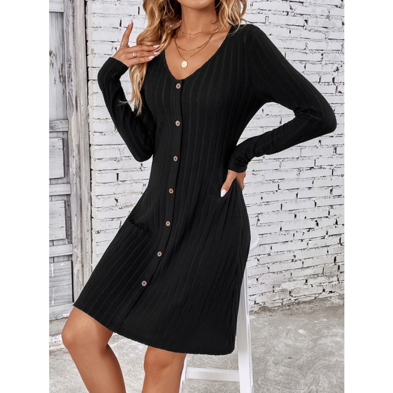 レディース 春秋 膝丈スカート ファッション Vネック ウエスト 長袖ワンピース
