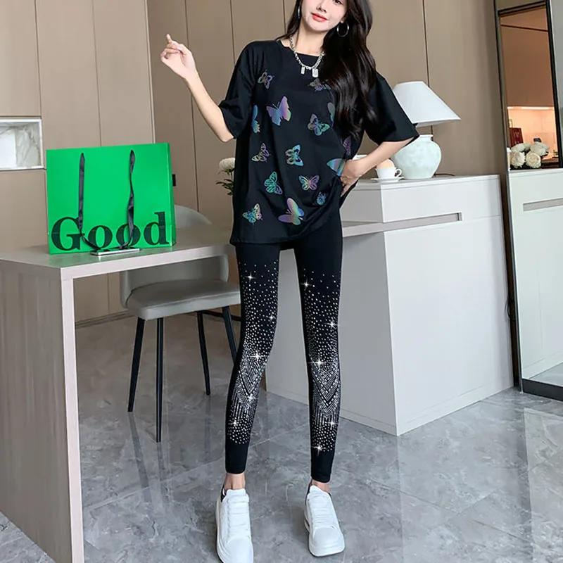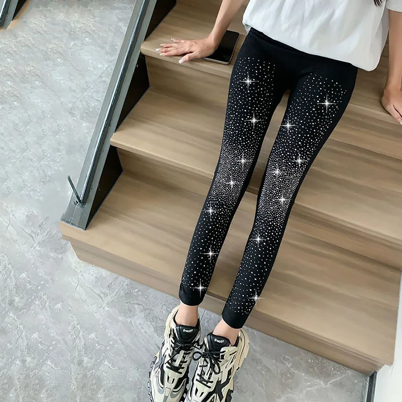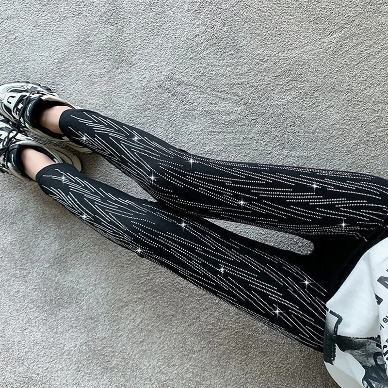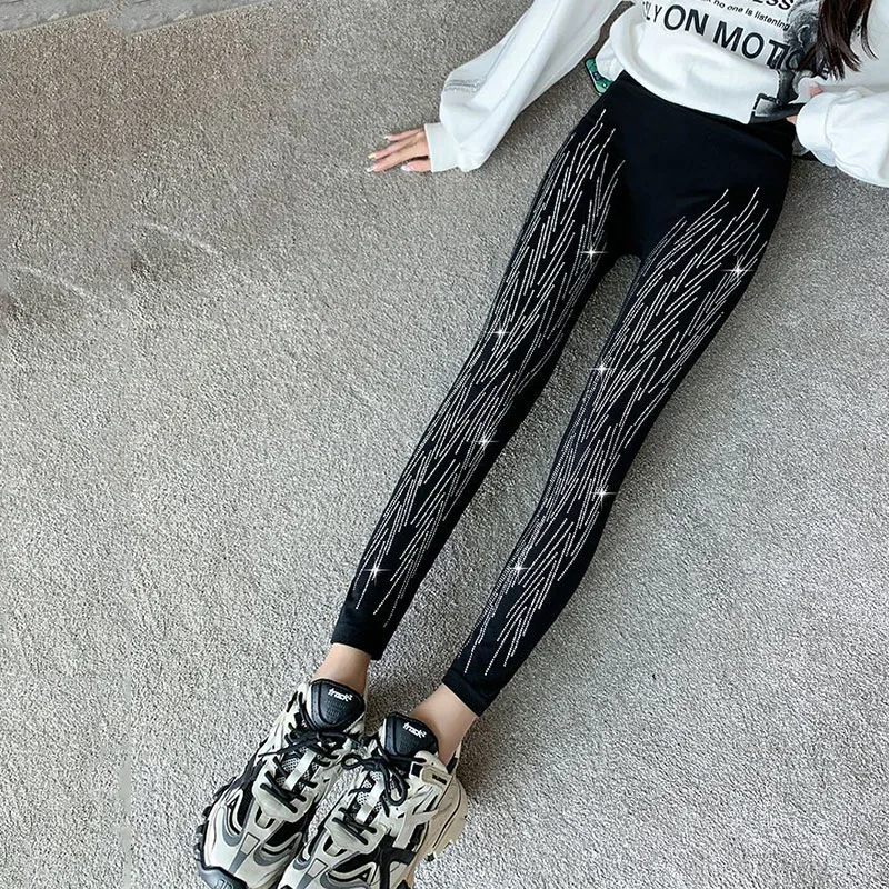 Xpqbb ブラック ストレッチ ラインストーン スキニーレギンス レディース 秋冬 厚手 ベルベット アンクル丈 パンツ トレンド 弾力性 キラキラ レギンス