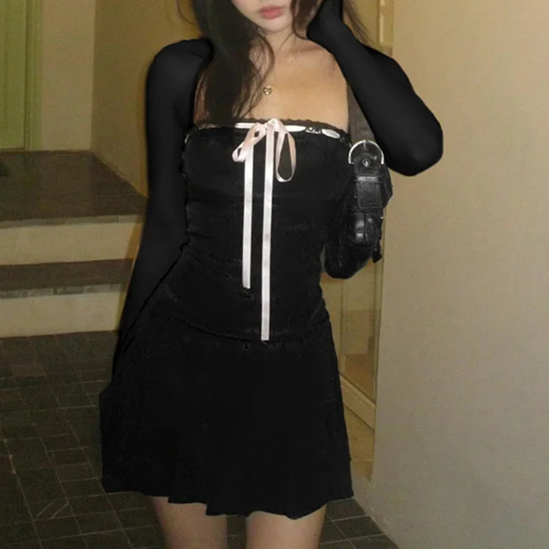 Y2K ブラック スクエアカラー 長袖ドレス レディース エレガント レースアップ リボン Aライン ミニドレス 韓国風 ショートドレス エステティック服 원피스